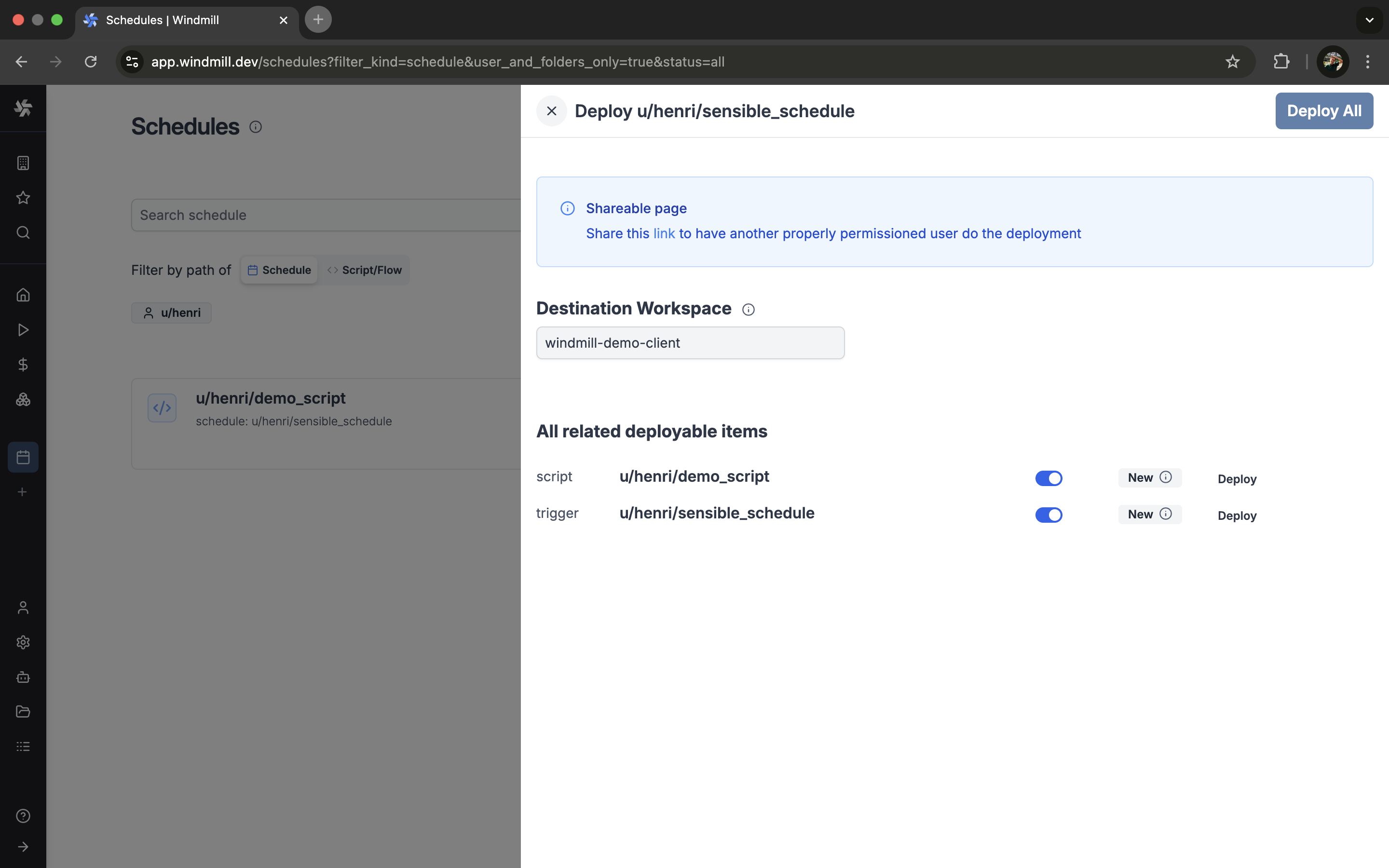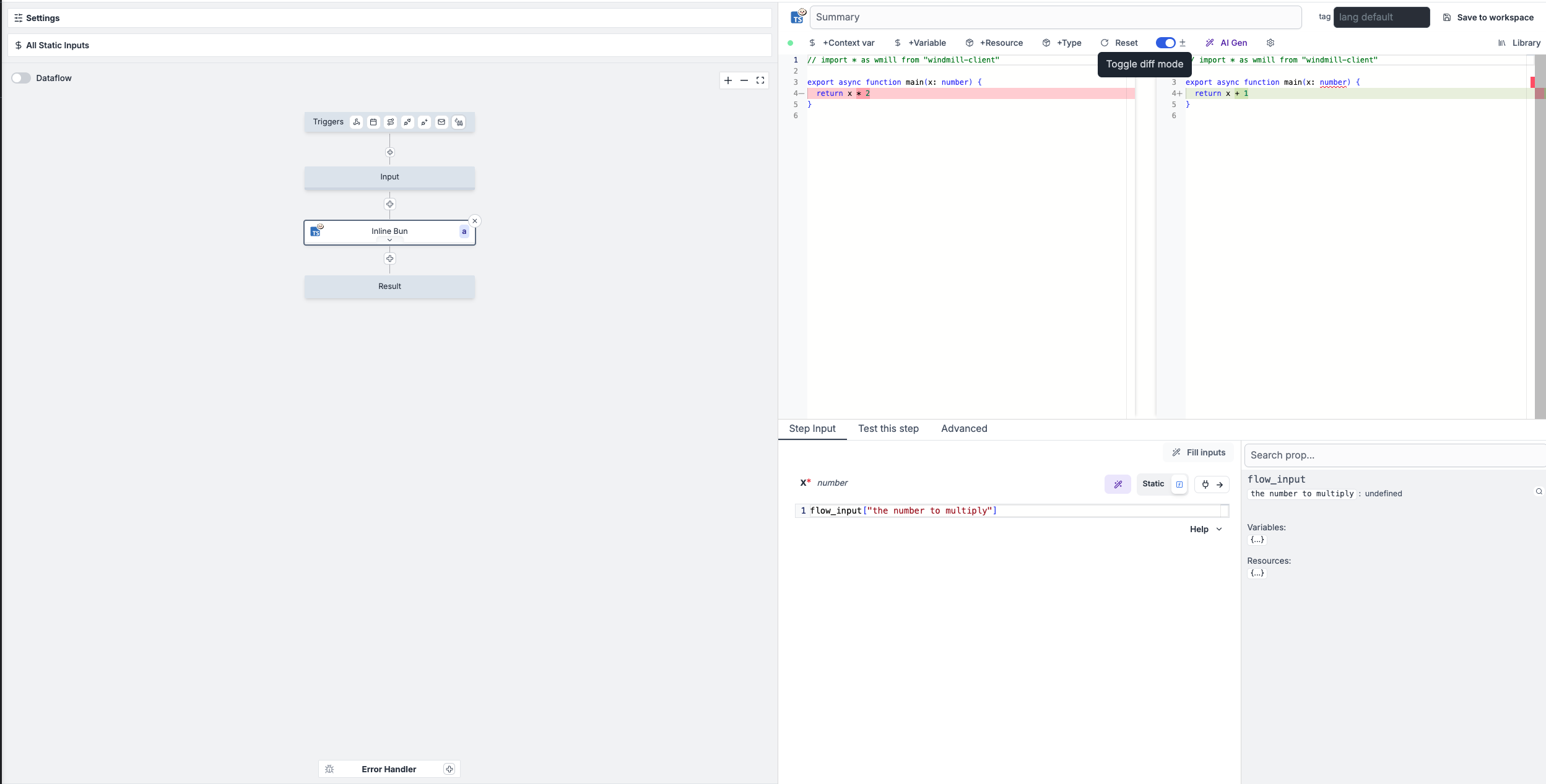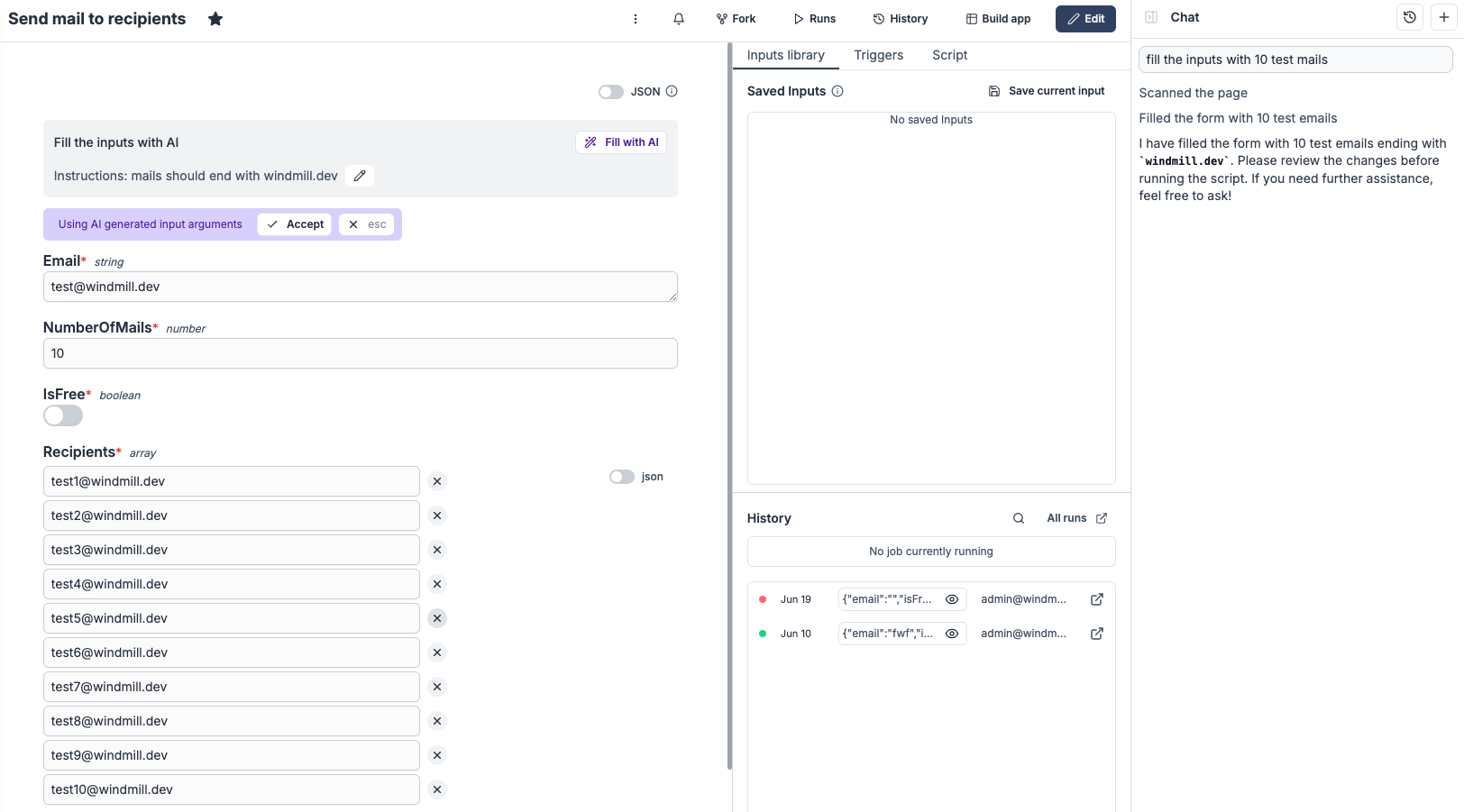 The AI Chat panel now supports API mode, allowing direct interaction with Windmill resources through conversational commands. Access jobs, scripts, flows, resources, variables, schedules, and workers using natural language queries.