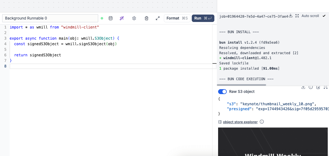 compatible object) as a result OR to stream text before the result is fully returned. It works with Typescript (Bun, Deno, Nativets), Python and is compatible with agent workers. If not returning the stream directly, we introduce 2 new functions on our SDK: wmill.streamResult(stream)